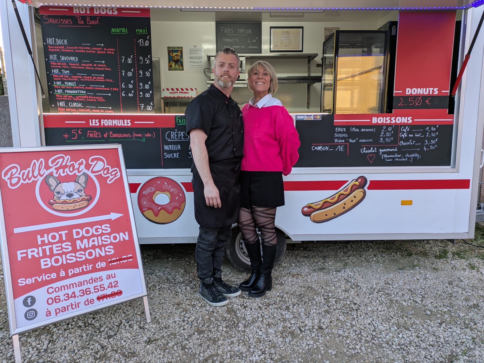 Bull Hot Dog, c’est avant tout l’histoire de Mark et Valérie, deux passionnés de street food et de bonne humeur. Ils ont décidé de créer leur propre food truck pour partager leur amour du hot-dog, version généreuse et gourmande.